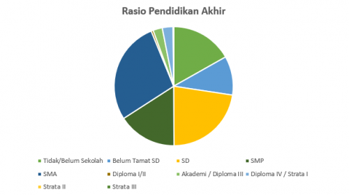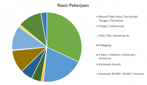 Jumlah Belum/Tidak Kerja / Ibu Rumah Tangga / Pensiunan sebanyak 1.789 jiwa atau 31,9%, jumlah Pelajar / Mahasiswa sebanyak 1.102 jiwa atau 19,6%, jumlah PNS / TNI / Kepolisian RI sebanyak 65 jiwa atau 1,1%, jumlah Pedagang sebanyak 253 jiwa atau 4,5%, jumlah Petani / Pekebun / Peternak / Perikanan sebanyak 311 jiwa atau 5,5%, jumlah Karyawan Swasta sebanyak 594 jiwa atau 10,5%, jumlah Karyawan BUMN / BUMD / Honorer sebanyak 21 jiwa atau 0,3%, jumlah Buruh/Pembantu sebanyak 631 jiwa atau 11,2%, jumlah Dosen/Guru sebanyak 63 jiwa atau 1,1%, jumlah Wiraswasta sebanyak 621 jiwa atau 11%, dan jumlah Lainnya sebanyak 156 jiwa atau 2,7%.